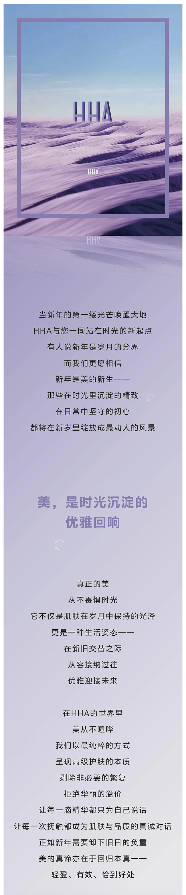 当新年的第一缕光芒唤醒大地,HHA与您一同站在时光的新起点,有人说新年是岁月的分界,而我们更愿相信新年是美的新生——那些在时光里沉淀的精致,在日常中坚守的初心,都将在新岁里绽放成最动人的风景。