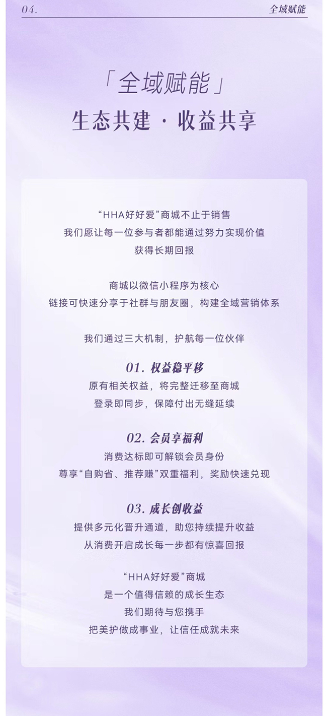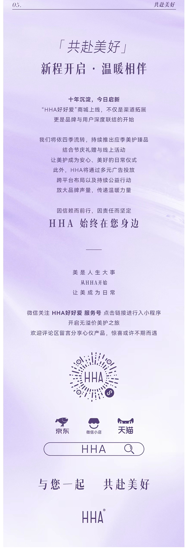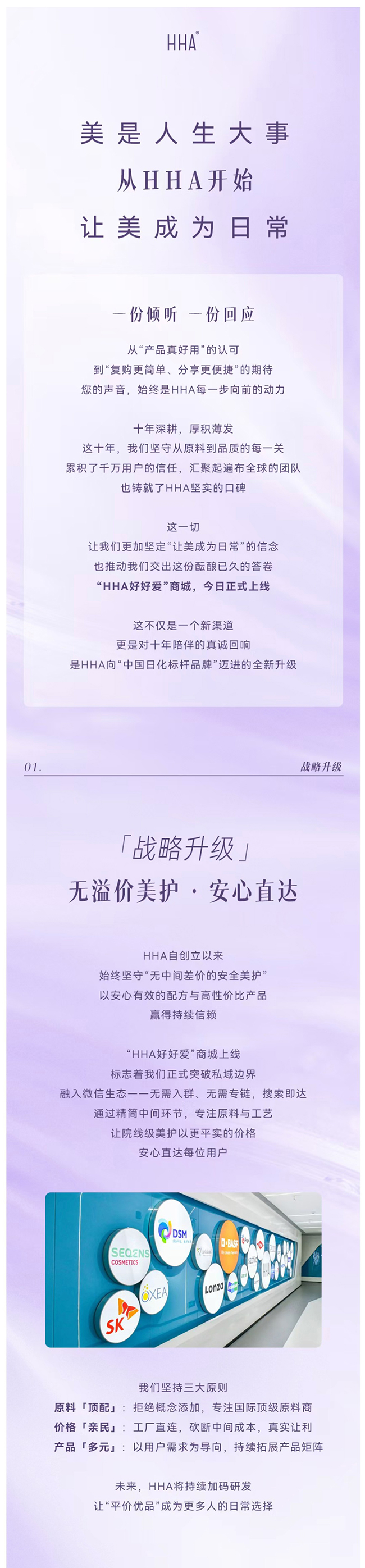 HHA官方商城,今日正式上线。这不仅是一个新渠道更是对十年陪伴的真诚回响是HHA向“中国日化标杆品牌”迈进的全新升级。